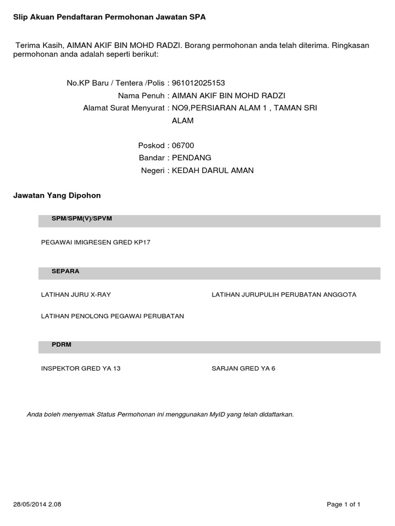 Slip Akuan Pendaftaran Permohonan Jawatan Spa Spm Spm V Spvm